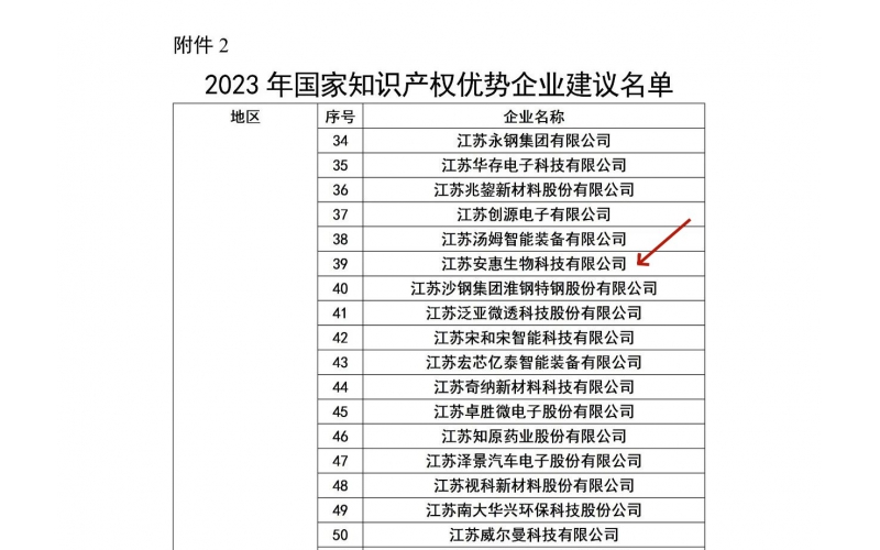 2023年11月,國(guó)家知識(shí)產(chǎn)權(quán)局公布了2023年度國(guó)家知識(shí)產(chǎn)權(quán)優(yōu)勢(shì)企業(yè)名單,江蘇安惠生物科技有限公司榜上有名。