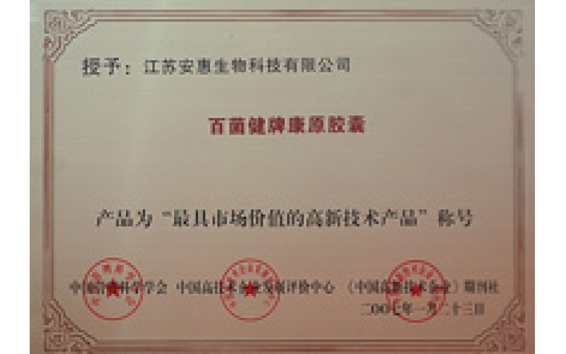 2007年1月24日,安惠百菌健牌康原膠囊產(chǎn)品獲得中國(guó)管理科學(xué)學(xué)會(huì)、中國(guó)高技術(shù)企業(yè)發(fā)展評(píng)價(jià)中心、中國(guó)高新技術(shù)企業(yè)期刊社聯(lián)合評(píng)定的“最具市場(chǎng)價(jià)值的高新技術(shù)產(chǎn)品”榮譽(yù)稱(chēng)號(hào)。同時(shí),百菌健牌康原膠囊還與公司的另一產(chǎn)品——靈芝孢子蟲(chóng)草菌絲體粉攜手獲得“江蘇省名牌產(chǎn)品”榮譽(yù)稱(chēng)號(hào)。