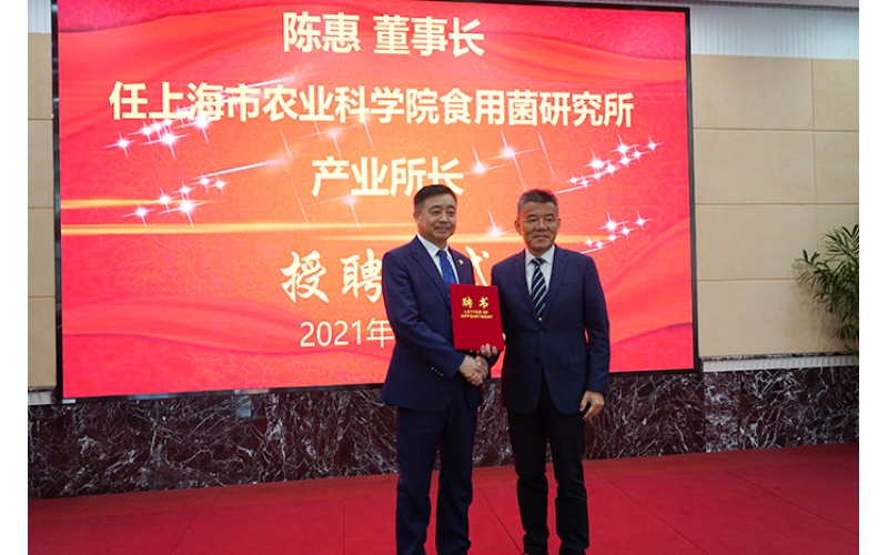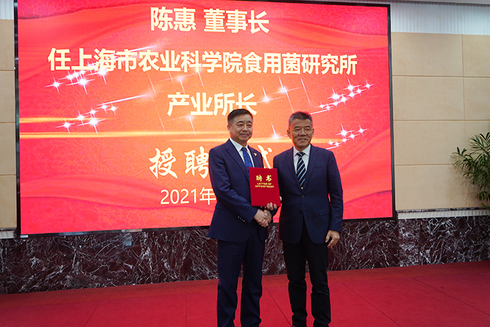 2021年3月22日,上海市農(nóng)業(yè)科學(xué)院食用菌研究所與江蘇安惠生物科技有限公司共同成立“聯(lián)合科技創(chuàng)新中心”舉行揭牌儀式。會(huì)上,安惠公司董事長陳惠受聘該院食用菌研究所產(chǎn)業(yè)所長。