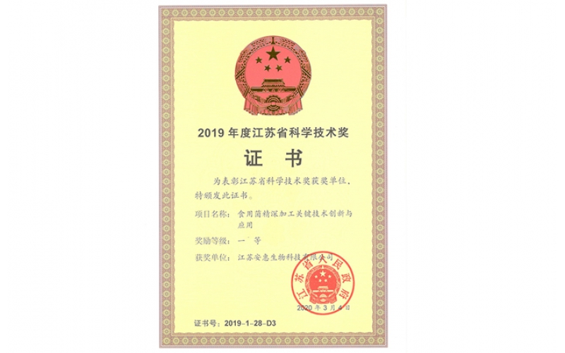 2020年3月,由江蘇安惠生物科技有限公司參與南京財(cái)經(jīng)大學(xué)、南京農(nóng)業(yè)大學(xué)、中國農(nóng)業(yè)大學(xué)等科研院所承擔(dān)的食用菌精深加工關(guān)鍵技術(shù)創(chuàng)新與應(yīng)用榮獲江蘇省科學(xué)技術(shù)獎(jiǎng)一等獎(jiǎng)。