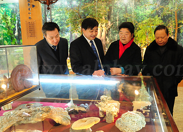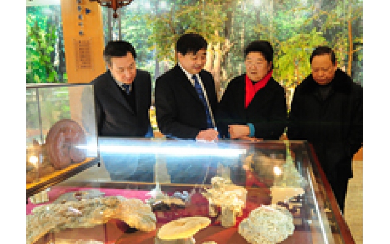 2011年1月25日,十屆全國(guó)人大常委會(huì)副委員長(zhǎng)顧秀蓮(右二)在南通市人大常委會(huì)副主任宋飛(右一),南通市委常委、市委秘書長(zhǎng)黃巍東(左一)的陪同下參觀中華靈芝文化館。