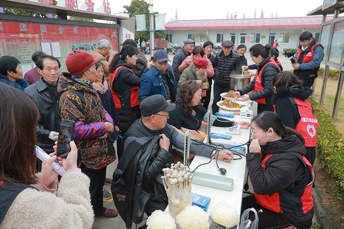 在闞家庵村活動中心,黨總支書記陳忠熱情地接待了安惠江海志愿者一行,并簡要介紹村情??v有春寒料峭,也抵擋不住大家的熱情,學雷鋒活動吸引了眾多村民前來參加。安惠江海志愿者熱心地為村民們測量血壓,提供健康咨詢。安惠會議中心大廚精心準備了美味的菌菇菜肴:黑椒汁杏鮑菇、糖醋木耳、蛋黃蟹味菇、南瓜茸銀耳,引得村民們連連豎起大拇指:“好吃好吃真好吃!”這些菌菇要怎么烹飪?里面加了什么材料?吃了對人體有什么好處?安惠江海志愿者詳細地為村民們一一解答,并為他們普及“一葷一素一菇”的健康飲食理念。